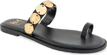A textured row of coins brings unmistakable warm-weather style to a sandal secured by a trendy toe loop.