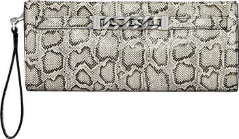 Curb-link chain adds brand-signature charm to a slim snakeskin-patterned clutch shaped from faux leather and held by a wristlet strap.
