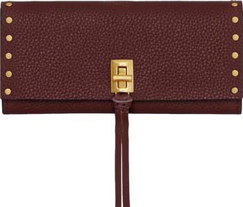 Long strands hang from the clasp of this leather continental wallet that's traced with studs down the sides for signature Rebecca Minkoff style.