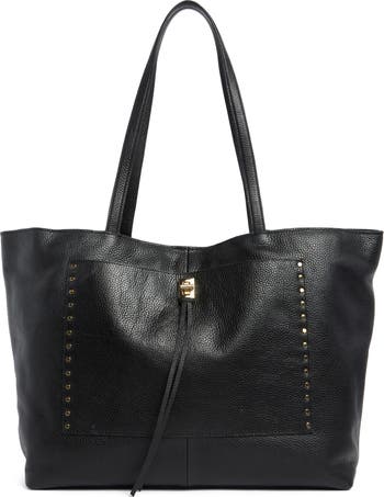Carry your essentials in this roomy pebbled-leather tote bag featuring dual shoulder straps, an easy-access front pocket and gleaming hardware.