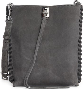 Whipstitching outlines the slightly slouchy silhouette of this suede bag finished with metallic-stamped branding and a removable shoulder strap.