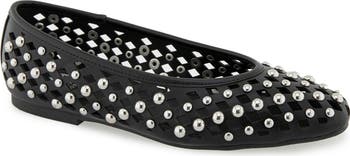 Unique cutouts and silvery studded hardware lend eye-catching appeal to a signature flat crafted from faux leather and elongated by a pointy toe.