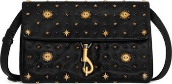 Metallic stars and evil-eye motifs bring celestial shine to this soft leather crossbody bag featuring polished hardware and an adjustable, removable strap.