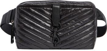 Signature chevron quilting and durable nylon distinguish a structured belt bag fitted with an adjustable strap for styling versatility.