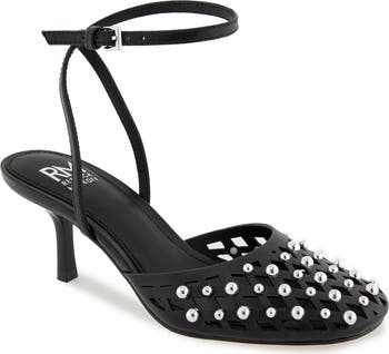 Unique cutouts are highlighted by silvery studded hardware on the pointy-toe vamp of a modern pump secured by an ankle strap.
