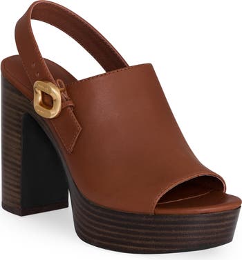 Goldtone hardware adds a signature flourish to a slingback sandal set on a lofty platform sole.