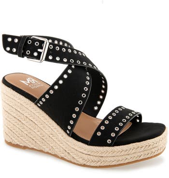 Grommet hardware punctuates the vamp and crisscrossing ankle strap of an espadrille sandal lifted by a low platform and towering wedge.