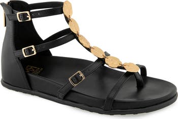 A row of textured coins bring shimmer and shine to a strappy cage-like sandal that delivers unmistakable summer style to your casual looks.