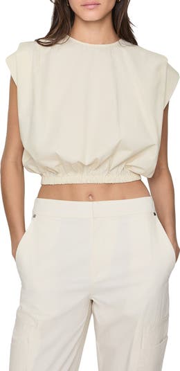 Sharp shoulder pleats and angular cap sleeves bring a sculptural silhouette to this crop top made from crisp poplin and fitted with a comfortable elastic waist.