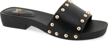 Polished stud hardware neatly outlines the wide vamp strap of a slide sandal set on a low block heel that's easy to walk on.