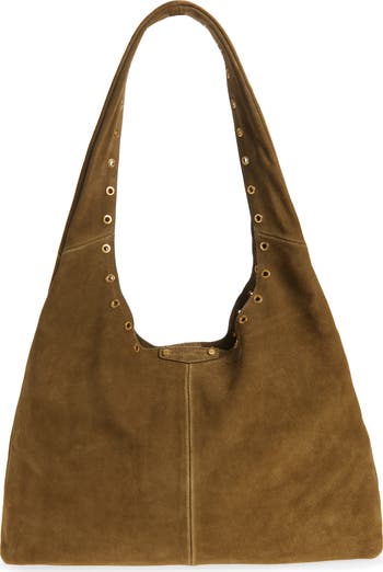 Gilded rivets and rugged suede add casual edge to a slouchy hobo bag you'll reach for on repeat.