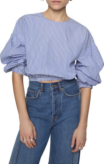 Pencil stripes punctuate a breezy cotton-poplin top that features billowy sleeves and an elasticated waist for a blouson effect.