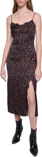 Rosy blooms and lilts of lace sweeten a soft slipdress accented with a side slit.