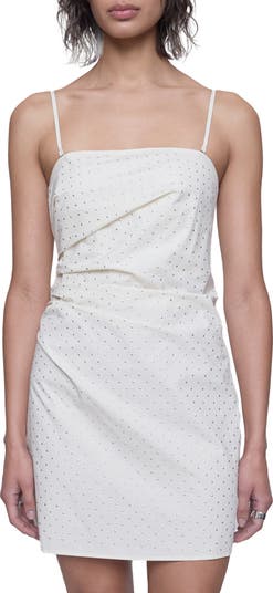 Sharp pleats create a figure-hugging fit in this sparkly party-ready minidress covered in glitzy rhinestones that make it a total keeper.