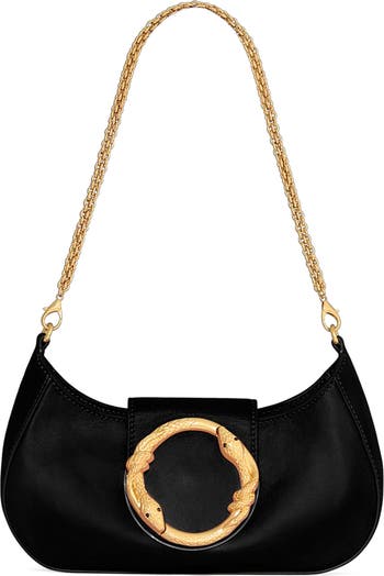 Polished snake hardware brings an edgy vibe to a slim shoulder bag shaped from smooth leather to elevate your everyday look.