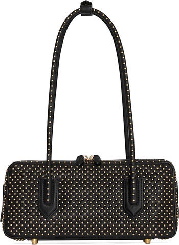 Gleaming studs punctuate the smooth leather of this elongated bag designed with rolled shoulder straps in a highly structured silhouette.