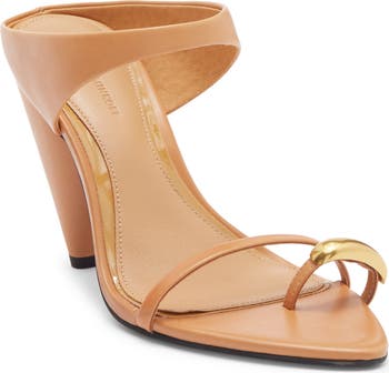 A hardware-enriched toe ring and tapered ankle cuff add contemporary intrigue to a pointy-toe sandal lofted by an architectural heel.
