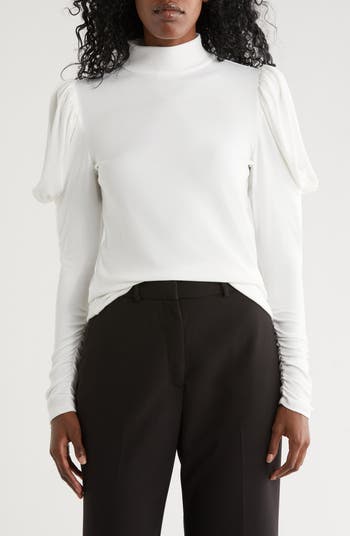Cascading ruffles create elegant draping at the sides of this mock-neck top made from a supersoft modal blend.