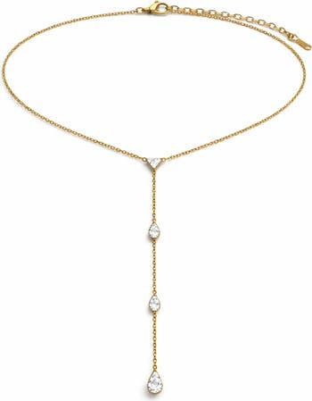 Triangle and pear-shaped cubic zirconia accents accentuate the lariat design of this Y-necklace dipped in an 18k-gold finish.