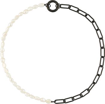 Bring some romantic edge to your casual ensembles with this half-chain necklace showcasing lustrous cultured pearls and oval links.