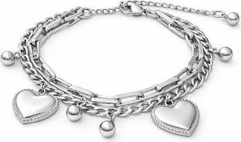 Show off romantic shine with this layered paper-clip and curb-chain bracelet suspending polished heart and orb charms.