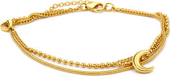 A duality of textures distinguishes this layered chain bracelet highlighted with a crescent moon charm for celestial style.