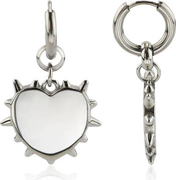 Bring a romantic edge to your look with these spiked heart drop huggie-hoop earrings crafted from hypoallergenic stainless steel with a glossy finish.