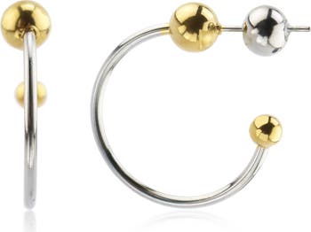 A two-tone finish brings eye-catching shine to these slender beaded hoop earrings crafted from hypoallergenic stainless steel.