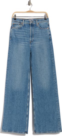A high waist and wide legs bring a '70s-inspired aesthetic to stretch jeans featuring fading and whiskering for lived-in appeal.