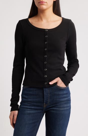 Perfect for wearing on its own, this soft cotton cardigan is fashioned with a scoop neck and held in place with a snap placket.