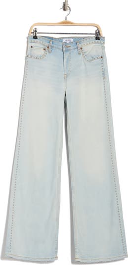 Polished round studs outline the sides, waistband and front scoop pockets of these wide-legged jeans cut from stretch denim in a light wash.