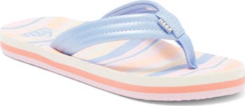 A printed footbed adds charm to a warm weather-ready flip flop that is created with comfortable quilted top straps.