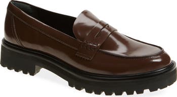 A chunky block heel and durable lug sole provide a sturdy foundation for a versatile penny loafer rendered in rich leather for timeless sophistication.