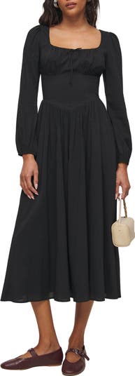 A LBD that's anything but basic: this flowy midi dress in breezy organic cotton is given dimension with a shirred waist and party-ready puffed sleeves. The split-sweetheart neckline is playfully elevated with picot trim, showcasing the label's attention to detail.