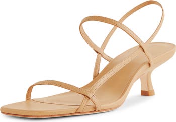 Bold angles and slender straps make every step count in a sandal crafted from soft Brazilian leather with a blunted toe in the front and the back cantilevered smartly over a broken kitten heel.