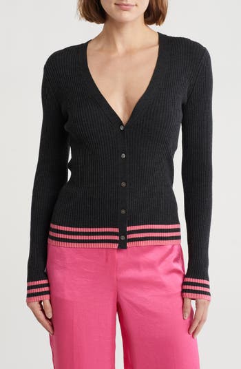 Contrast stripes highlight the cuffs and hem of a ribbed cardigan knit from soft wool yarns for exceptional warmth and comfort.