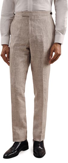 Lightweight, breathable linen ensures soft comfort in these patterned dress pants in a flat-front cut.