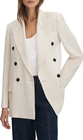A double-breasted silhouette puts the final polish on this textured blazer framed with classic notched lapels.