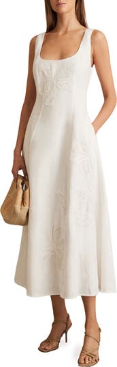 Shimmering sequins highlight the floral appliqués of this effortlessly elegant A-line dress made from soft, lightweight linen.