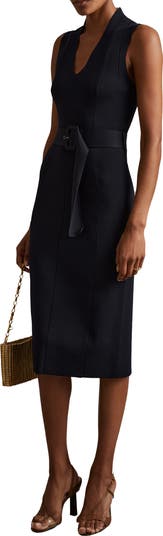 Be endlessly elegant in this sleek sleeveless sweater-dress designed with a wide defining belt.