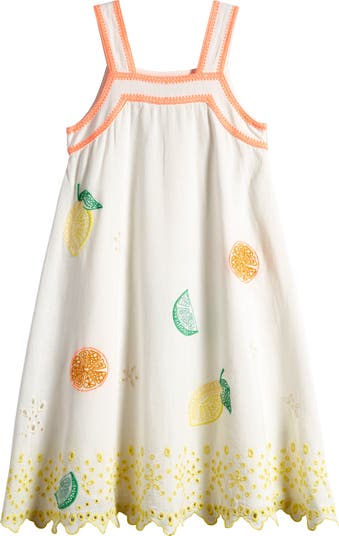 Juicy fruits and eyelet embroidery lend summertime charm to a cotton and linen dress cut in a classic A-line silhouette.
