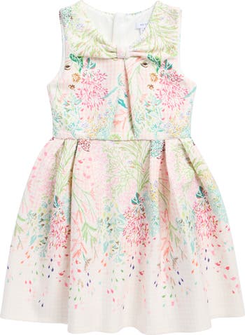 Watch them twist and twirl in this stretchy party dress with a flared skirt that gets extra drama from box pleats.