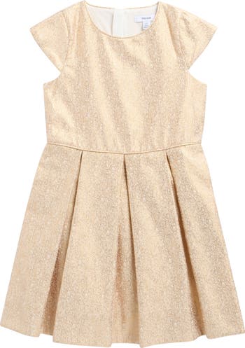They'll love to shine in this special-occasion frock made with a metallic sheen and punctuated with a pleated flared skirt.