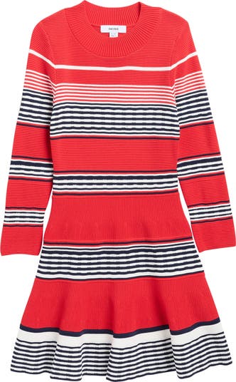 Slender stripes in a variety of hues bring personality to a ribbed sweater-dress knit with a fun-to-twirl-in skirt.