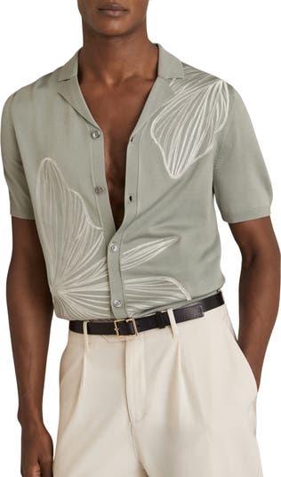 Painterly brushstrokes bring to life tropical blossoms against the fine knit of this camp shirt that takes you away to the islands even when you're not venturing far from home.
