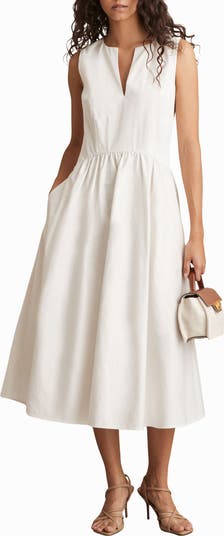 A summery sleeveless dress is updated in crisp poplin and finished with a pocketed flared skirt for a sweet silhouette.