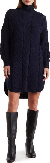 Chunky cables adds textural impact to a turtleneck sweater-dress knit from luxe yarn.