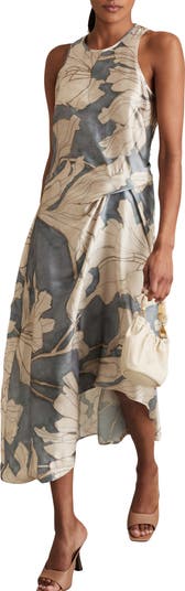 Dreamy hues and big blooms animate a party-ready dress cut from lustrous satin and finished with a flowy skirt.