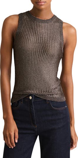 Shimmer in the sunlight in a racerback tank knit in a body-hugging chevron stitch from yarn enhanced with metallic threads.