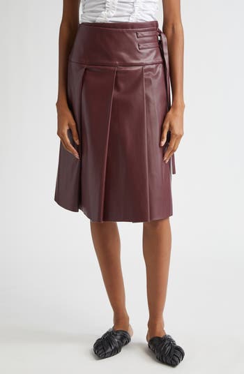 Signature bows cinch a midi skirt that combines the classic style of pleats and a dropped waist with the modern finish of faux leather.